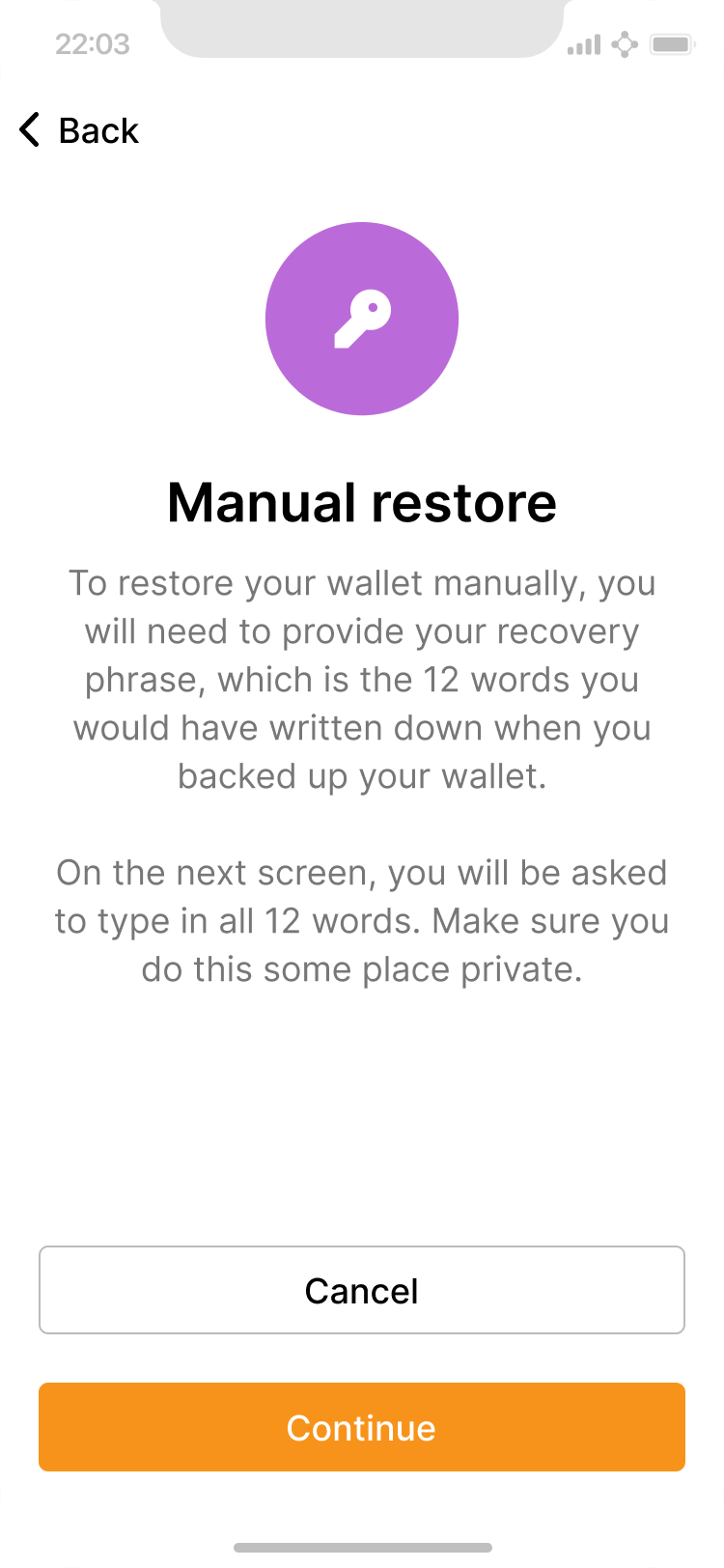 This involves a few more steps, but should work just as well as the auto cloud backup. This works great for basic recovery scenarios. In the manual restore, the primary difference is that the app asks the user to type in their recovery phrase. It will attempt to automatically pull their lightning channel state from cloud backup.