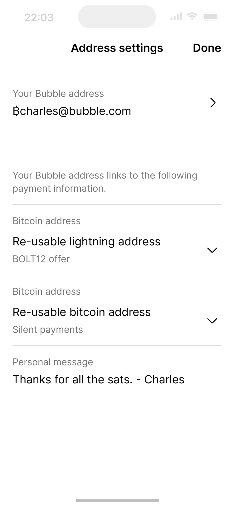By default, this address is configured with the wallet’s own BOLT 12 lightning offer.